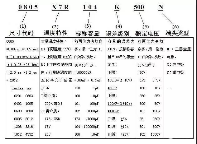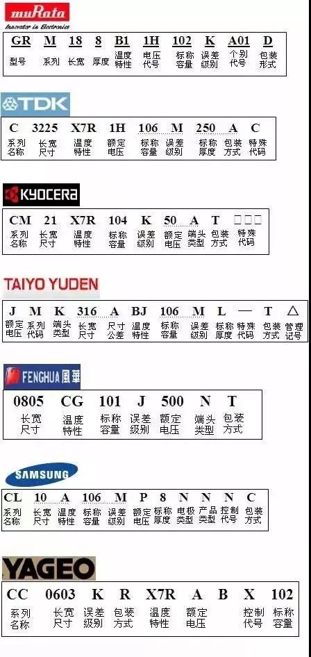 各制作商的產品規(guī)范命名規(guī)矩形式上不盡相同,但規(guī)范代號中基本上都包含:尺度、溫度特性、標稱容量、容量差錯等級、額外電壓和包裝方法等信息。